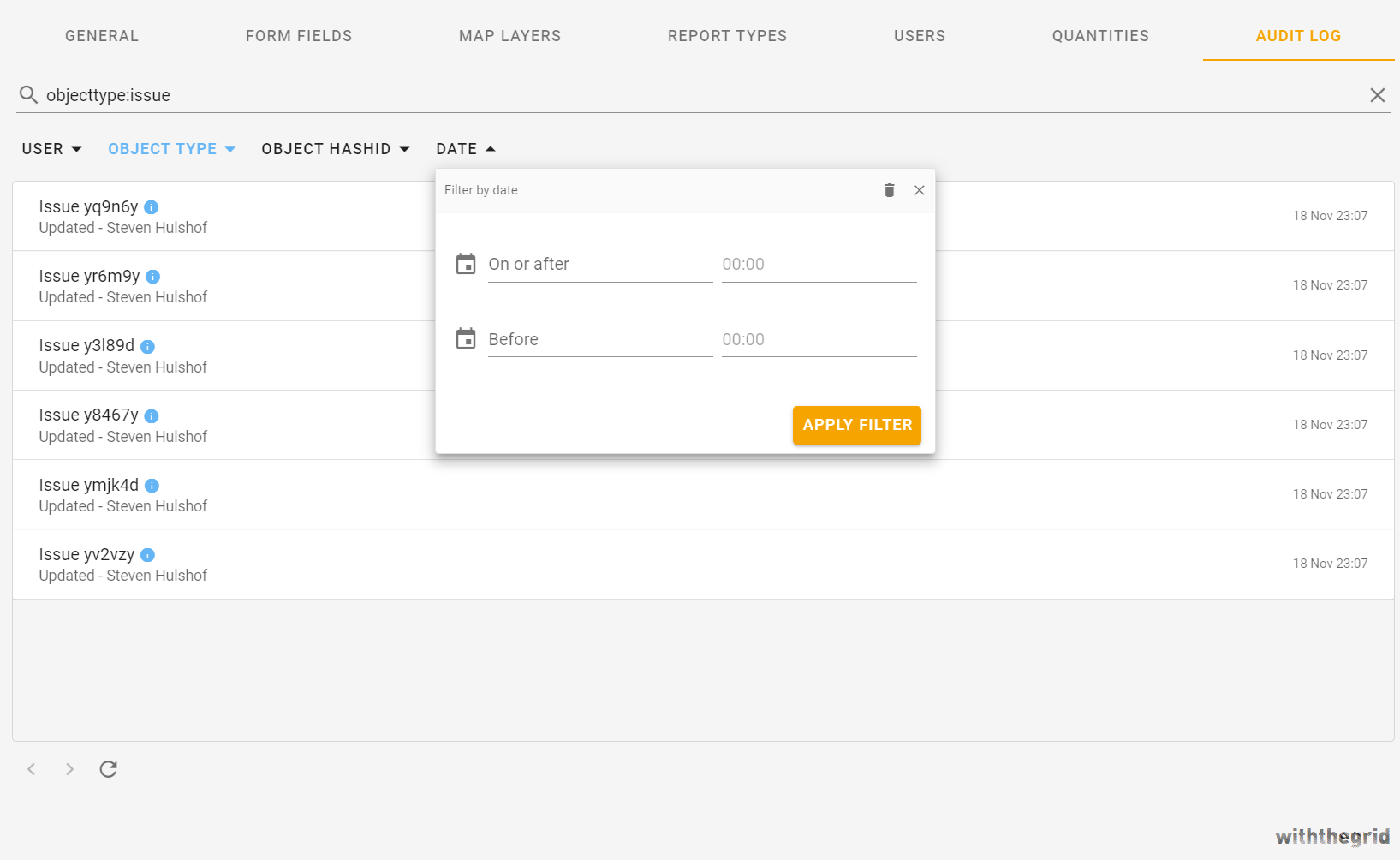 Each environment has an audit log showing which activities were carried out by which user. In this way a full audit trail is possible to backtrack any change of settings, addition of locations or closing of issues. You can filter by user, object type, object hashld and period.