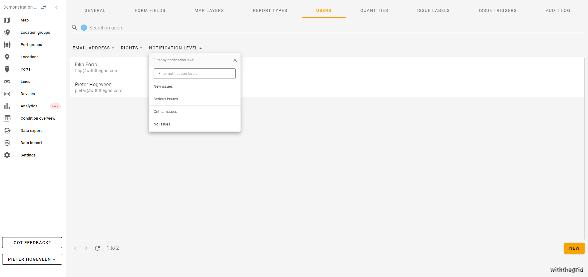 In the user section of the settings menu, you can see who is subscribed to issue notifications, and what level (serious, critical, none). This can also be seen when you open the dialog of a specific user.