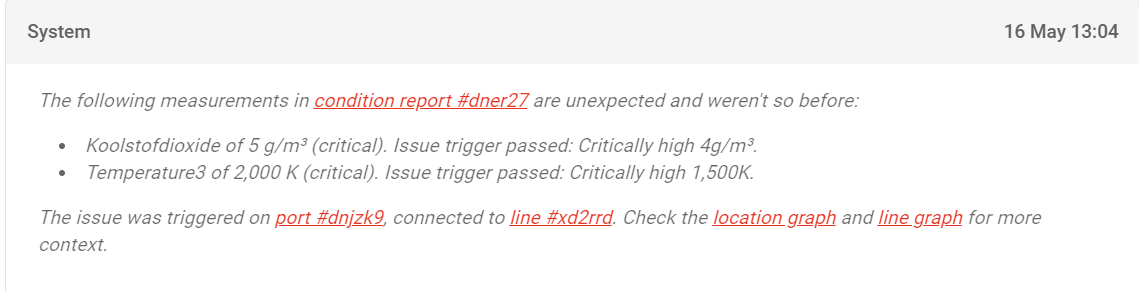 Issues can be triggered automatically by setting issue triggers. Issue triggers are defined by setting thresholds on the measurement values coming in. There are 3 urgency levels of issues: